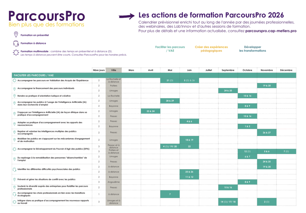 La programmation 2026 poursuit cette ambition : renforcer vos compétences métiers et transverses, outiller vos pratiques professionnelles face aux enjeux régionaux et sociétaux et encourager l’innovation pédagogique.